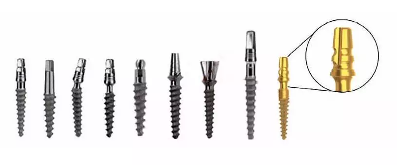 Классические, или современные, представляют собой удлиненные штифты из титана конической формы. Их длина 20-35 мм, что объясняется глубиной установки. Их особенность в том, что сам имплант и абатмент на нем для крепления протеза объединены в единую конструкцию. К тому же для быстроты и простоты установки на них имеется выраженная резьба.