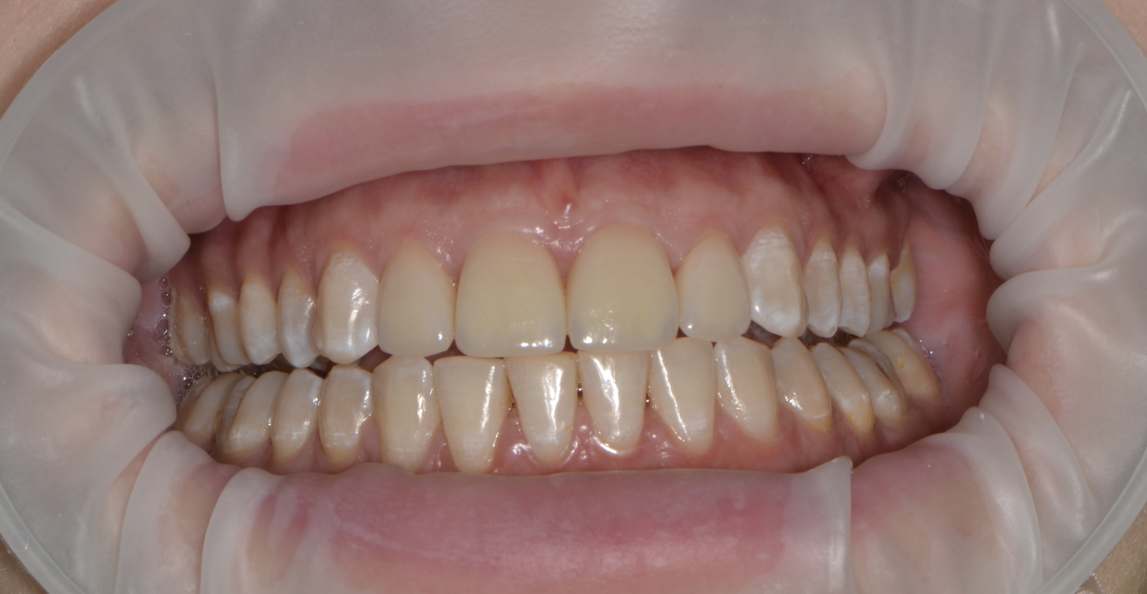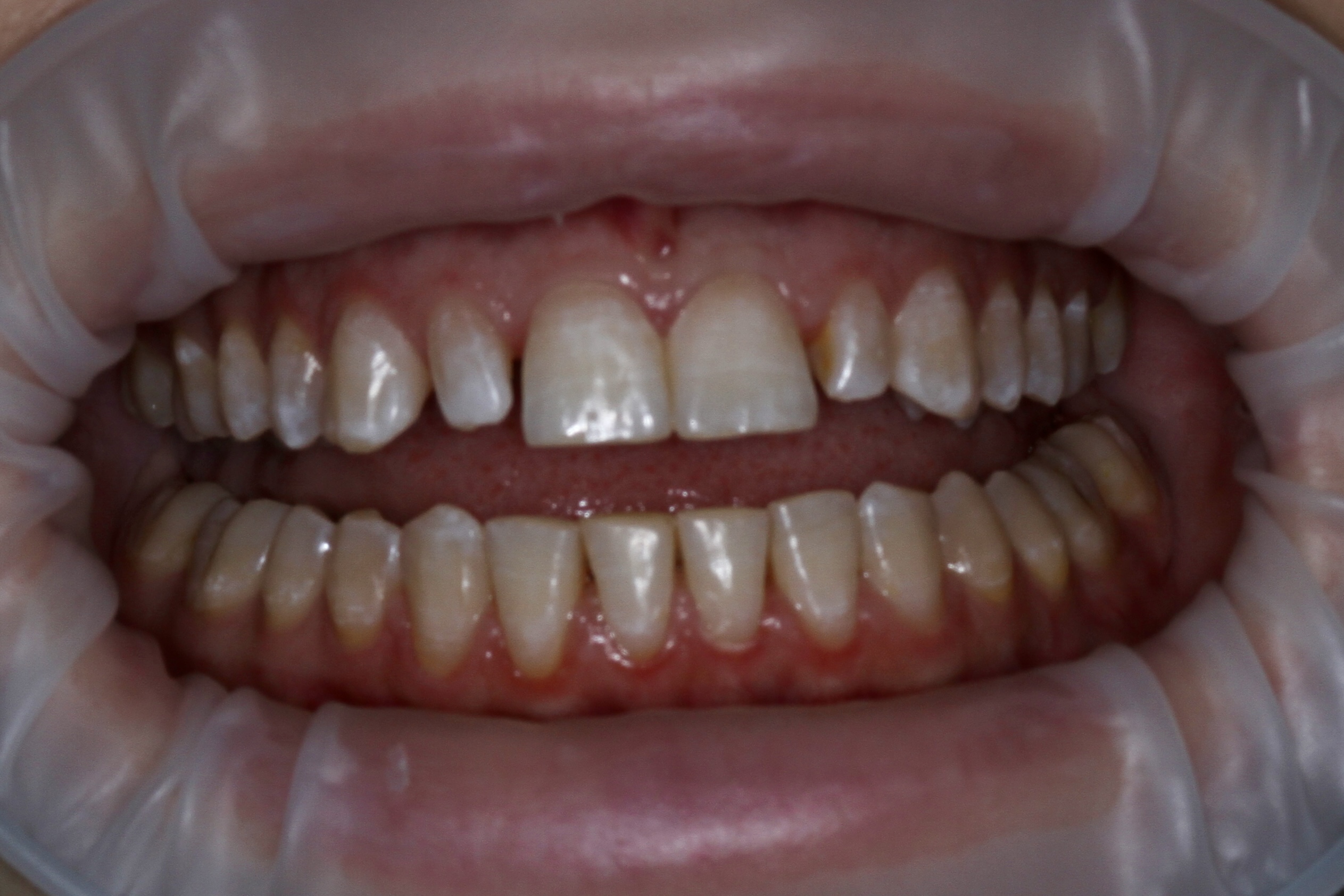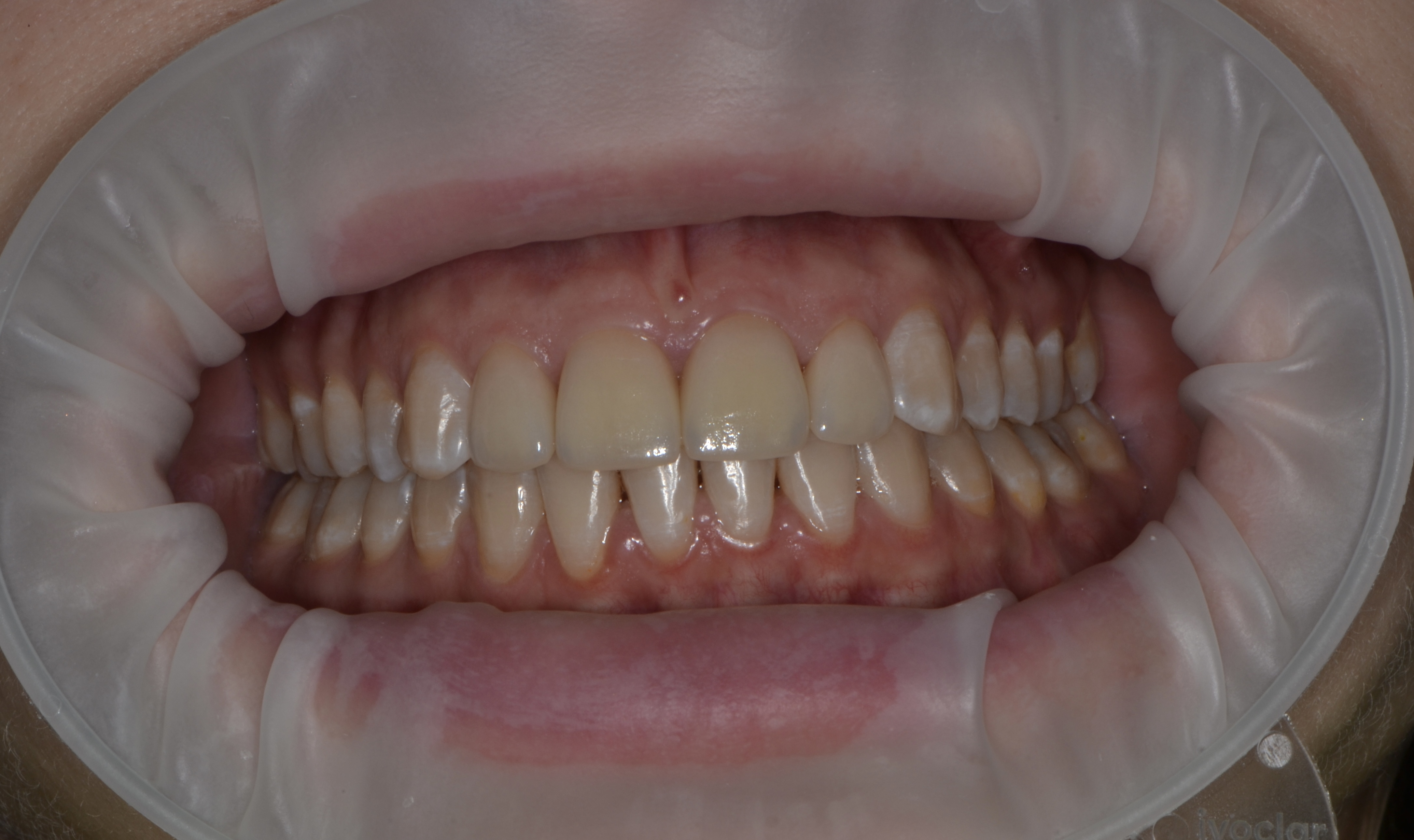 После проведенного ортодонтического лечения, для восстановления эстетики передних зубов, пациентке предложена установка керамических винир в области зубов 1.2, 1.1, 2.1, 2.2.