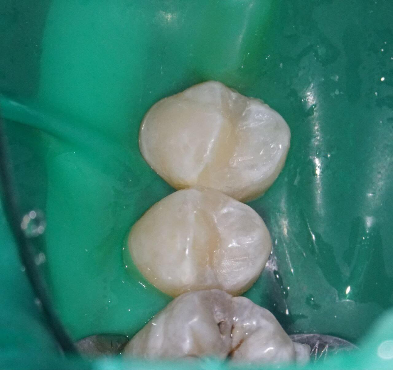 Кариес зубов 24, 25. Скрытый при осмотре без бинокуляров и микроскопа. В области тёмных фиссур (бороздок на жевательной поверхности) и на боковых поверхностях.