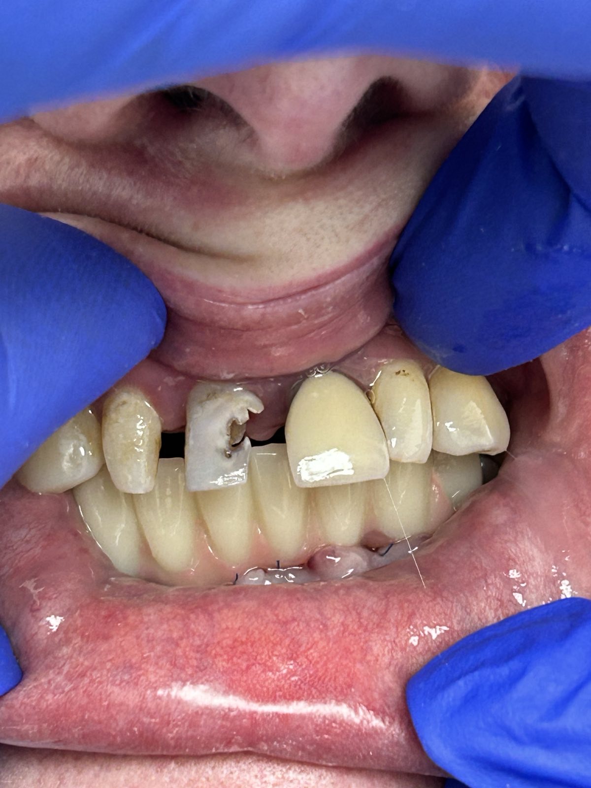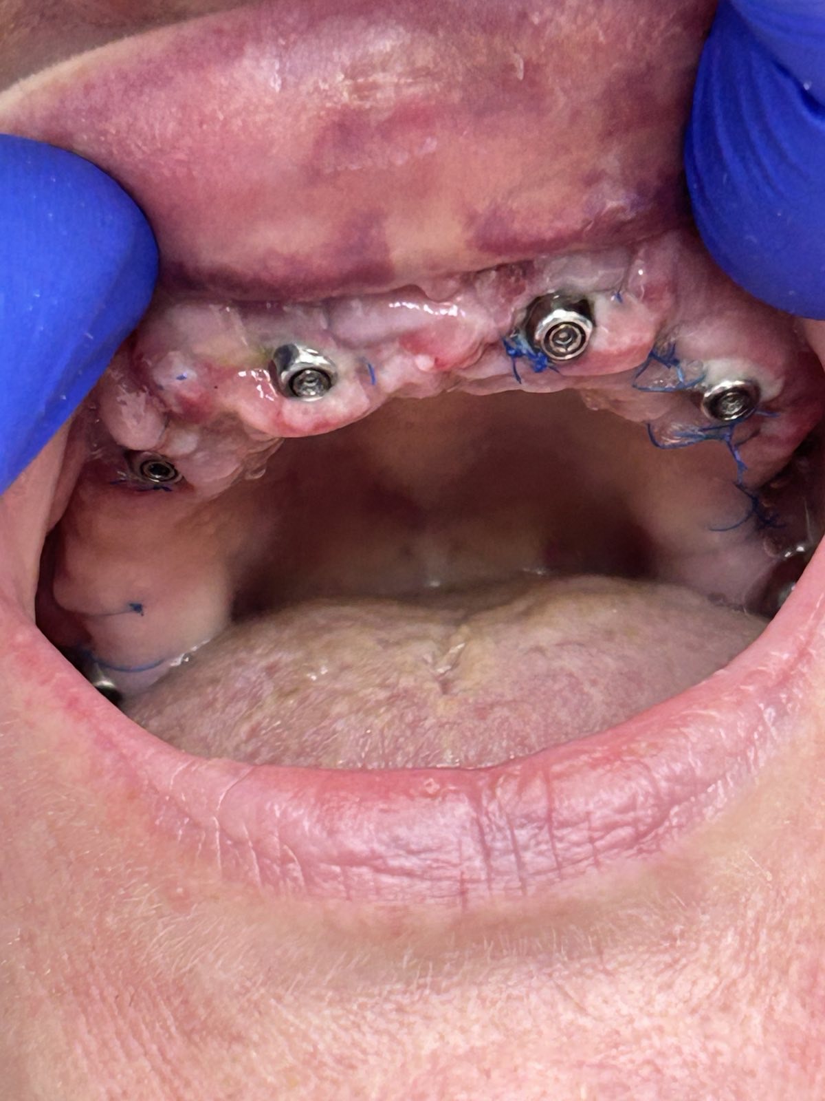 (Первое фото выполнено перед операцией на верхней челюсти, на нижней уже установлены импланты и первичный протез.)