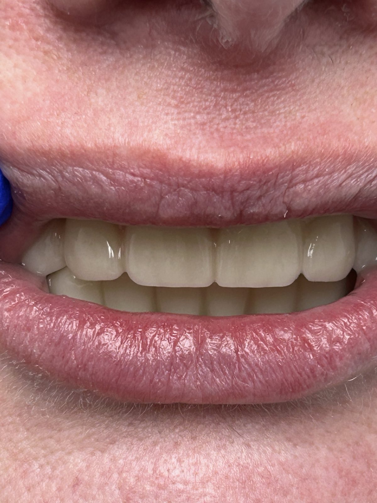 Проверено удаление 22 зубов, установлены по 6 имплантов на верхней и нижней челюстях с хорошими показателями первичной стабилизации. После имплантации проведено первичное временное протезирование. Через 6 месяцев пациентка готовится к перепротезированию (замене первичных протезов на протезы из металлокерамики).