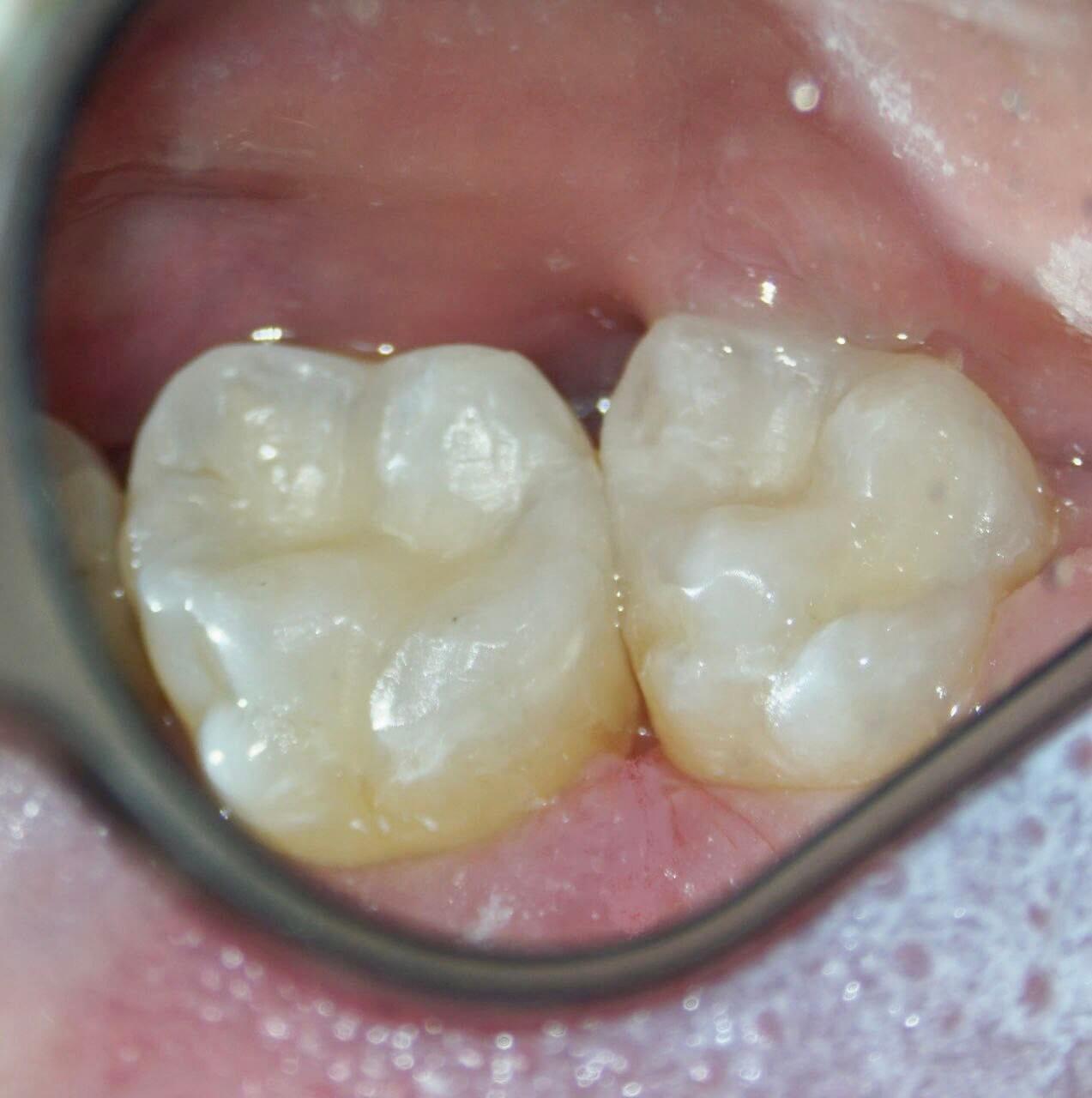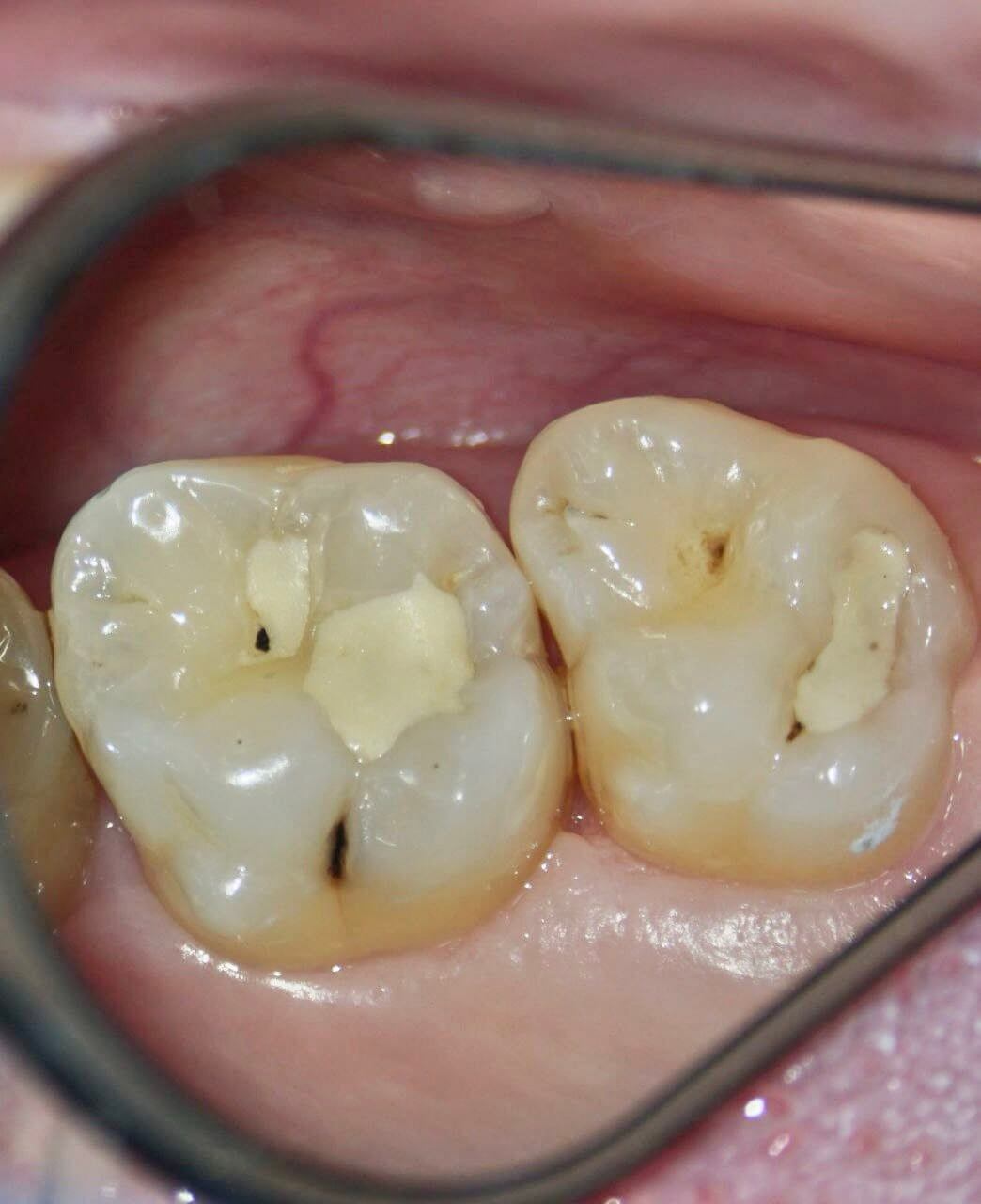Цель визита: восстановление жевательных поверхностей зубов после окончания 3 лет ортодонтического лечения. + жалобы на застревание пищи между зубами (17 имеет вогнутость, сформированная до ортодонтии из-за неправильного положения зуба) и кровоточивость из десневого сосочка.