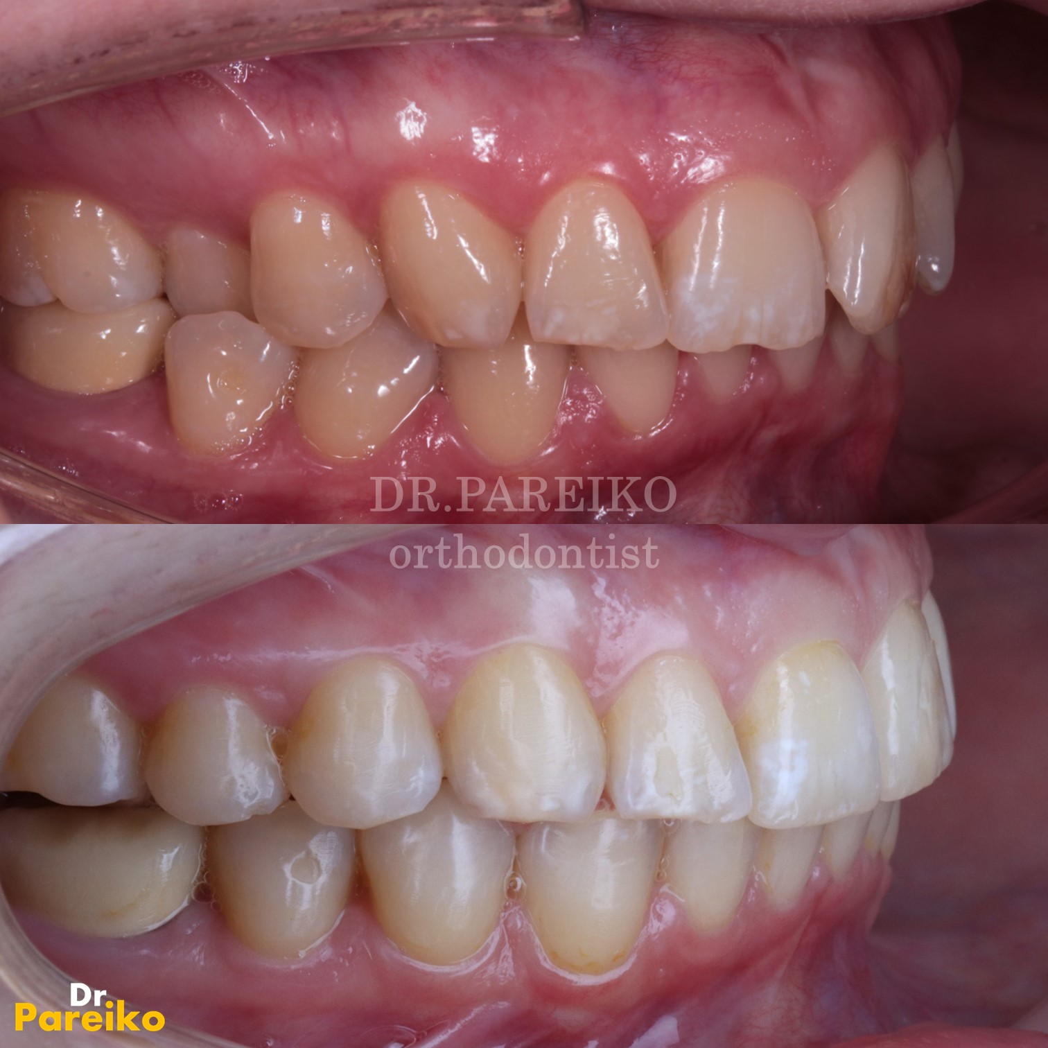 После окончания ортодонтического лечения, пациентке была проведена комплексная профессиональная гигиена, реставрация зубов 1.1 и 2.1, изготовлены ретенционные каппы и установлен несъемный ретейнер на н/ч.
